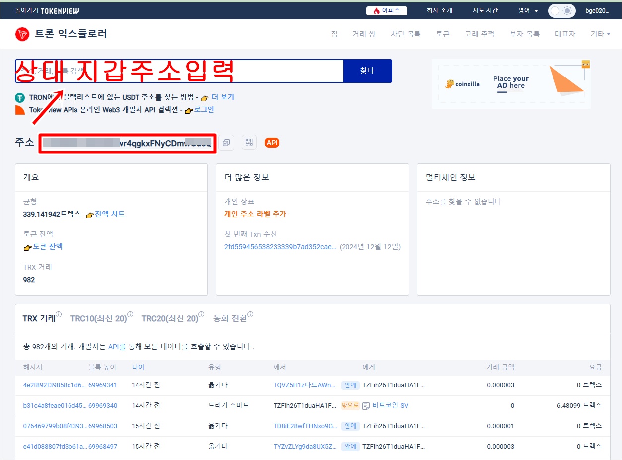 먼저 트론스캔에 접속하여 본인 지갑주소를 입력하면 상대 지갑주소를 알 수 있습니다.