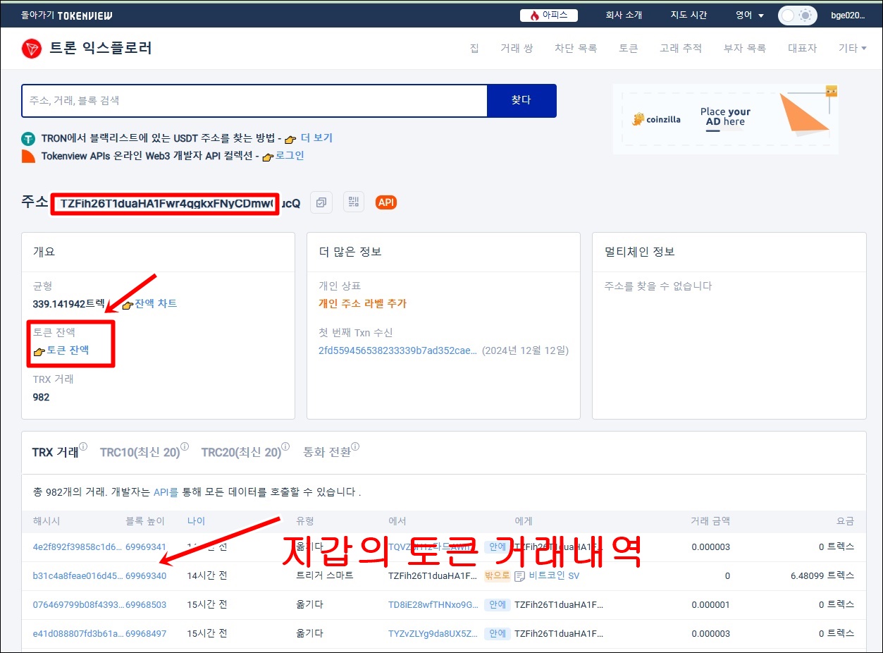 해당 지갑의 거래내역이 나옵니다.