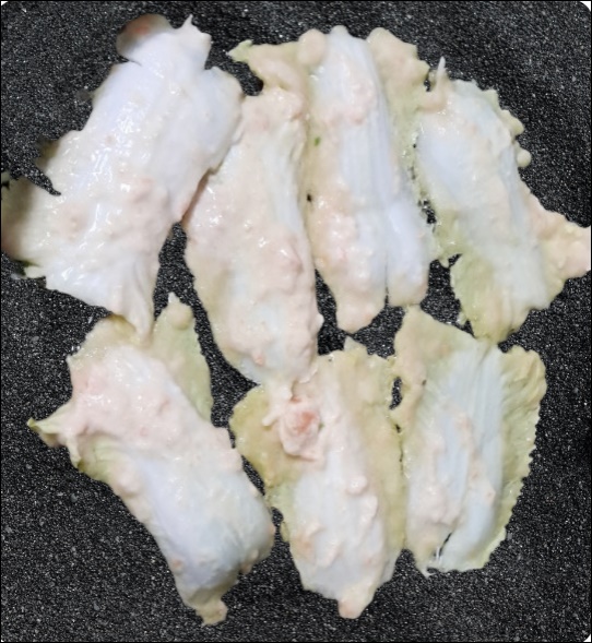 배추잎 한 장씩 반죽에 담가 골고루 묻혀 줍니다. 손으로 살짝 털어주면 너무 두껍지 않게 묻힐 수 있습니다.