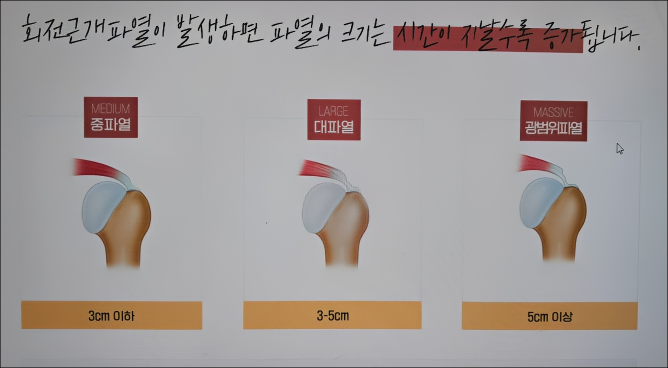 회전근개 파열은 자연 흡수되지 않으며 점차 부분 파열에서 완전 파열로, 소파열에서 광범위 파열로 진행하는 질환입니다.